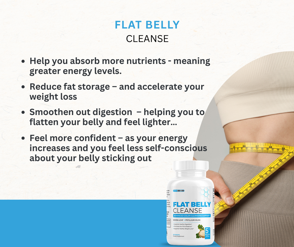 Flat Belly Cleanse is an advanced colon cleansing and digestive support supplement formulated to promote healthy elimination, balanced gut flora, and natural detox support. Crafted with probiotics, fiber, and botanical cleansing ingredients, this formula works gently with your body — helping you feel lighter, more comfortable, and internally refreshed.
